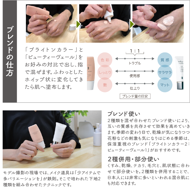 化粧下地は、いわばスキンケアとメイクの橋渡し役。「下地でしっかり、ファンデは薄く」を目指し、ファンデの発色と質感を肌へ同化させ、「メイク上手な人」から「もともと素肌がキレイな人」へと引き上げていけるよう開発が進められています。