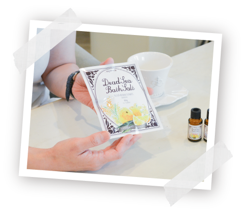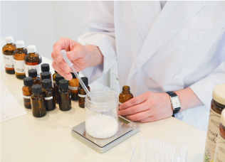香りの系統を定め、写真や画像などの視覚からも香りイメージを取り入れながら試作。ブレンドした精油を死海塩に少量ずつ添加していく。