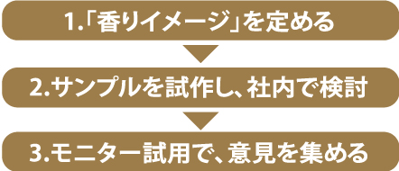2と3の工程を繰り返し実施し、モニター試用結果で8割以上の支持があれば完成となる。最後に工場で試作品を製造し、香りの最終確認を行う。
