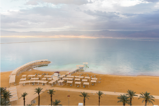 - 死海は、海抜マイナス400mの低水域にあり、ヨルダン川と絶え間なく湧く温泉からなる湖である。高温乾燥という気候で、水の蒸発が水分供給を上回る特殊な環境から海水の塩分濃度が約3%であるのに対し、死海の湖水は約30%の濃度を有している。この塩分には、マグネシウムを始め多くのミネラルが溶け込んでおり、その濃度は世界一と言われている。