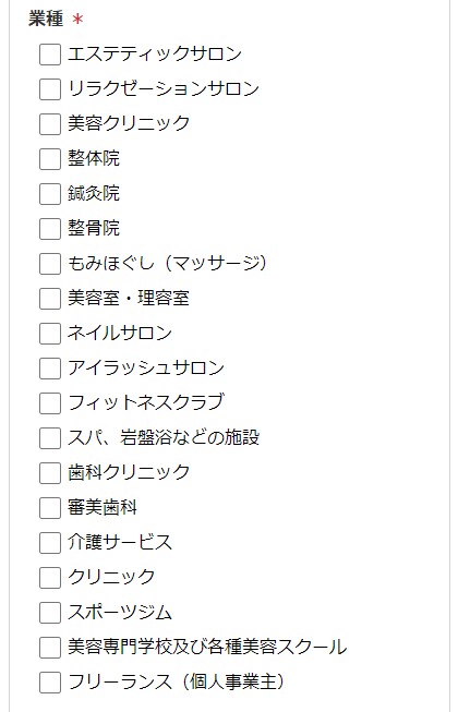・個人事業主のお客様は「フリーランス(個人事業主)」を選択してください。サロン名に関しては自動的に”ご担当者名(フリーランス)”で登録されます。